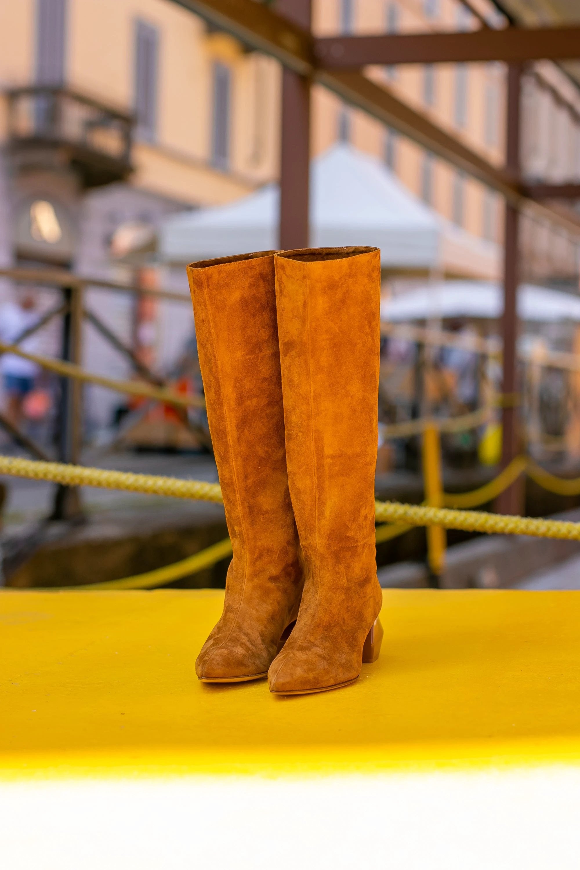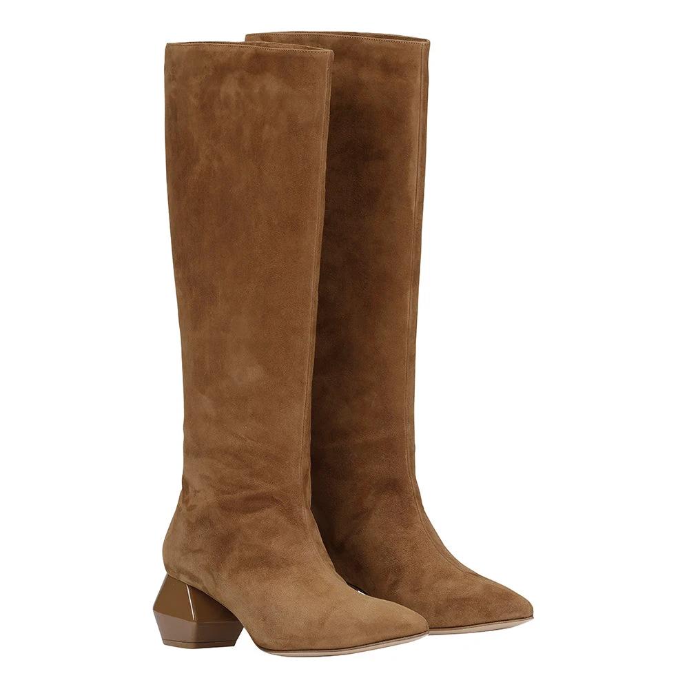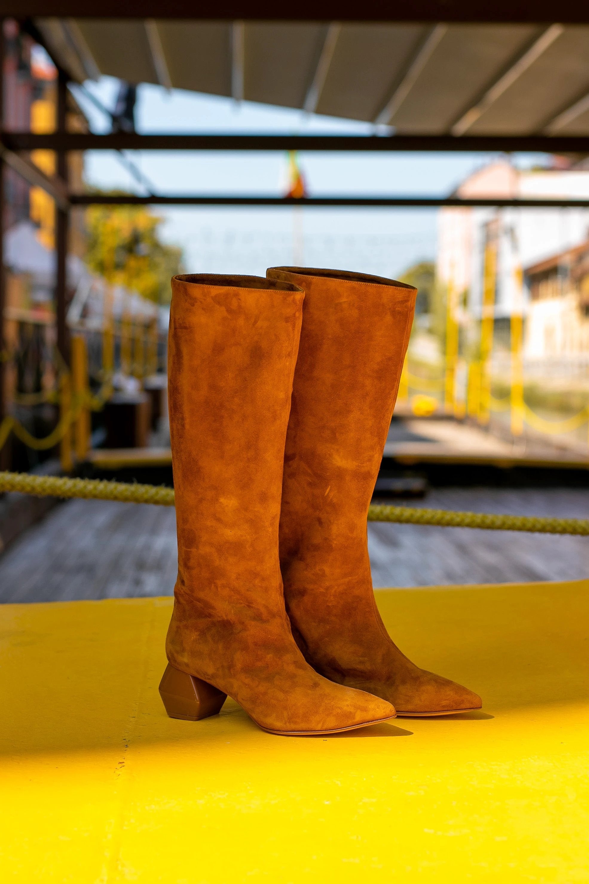The Boot Collection No. 6 fuses architectural style with timeless Italian craftsmanship. These cognac suede boots redefine everyday luxury with a sculptural, geometrical heel and a refined two-tone surface that elevates any outfit—from business meetings to evening socials.