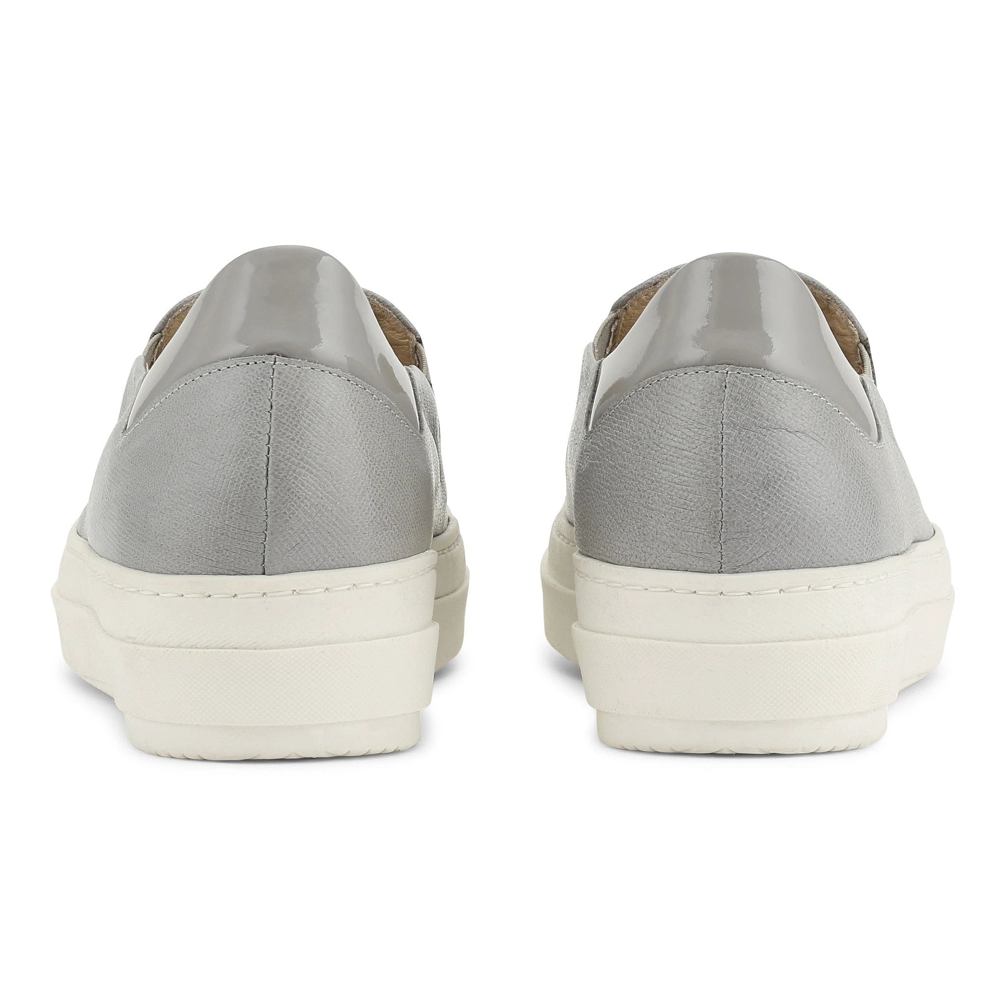 Introducing The Flat Collection No. 1 from ReyRey — slip into laid‑back luxe with these grey Saffiano leather sneakers, thoughtfully designed for the urban woman who values effortless style and everyday comfort.