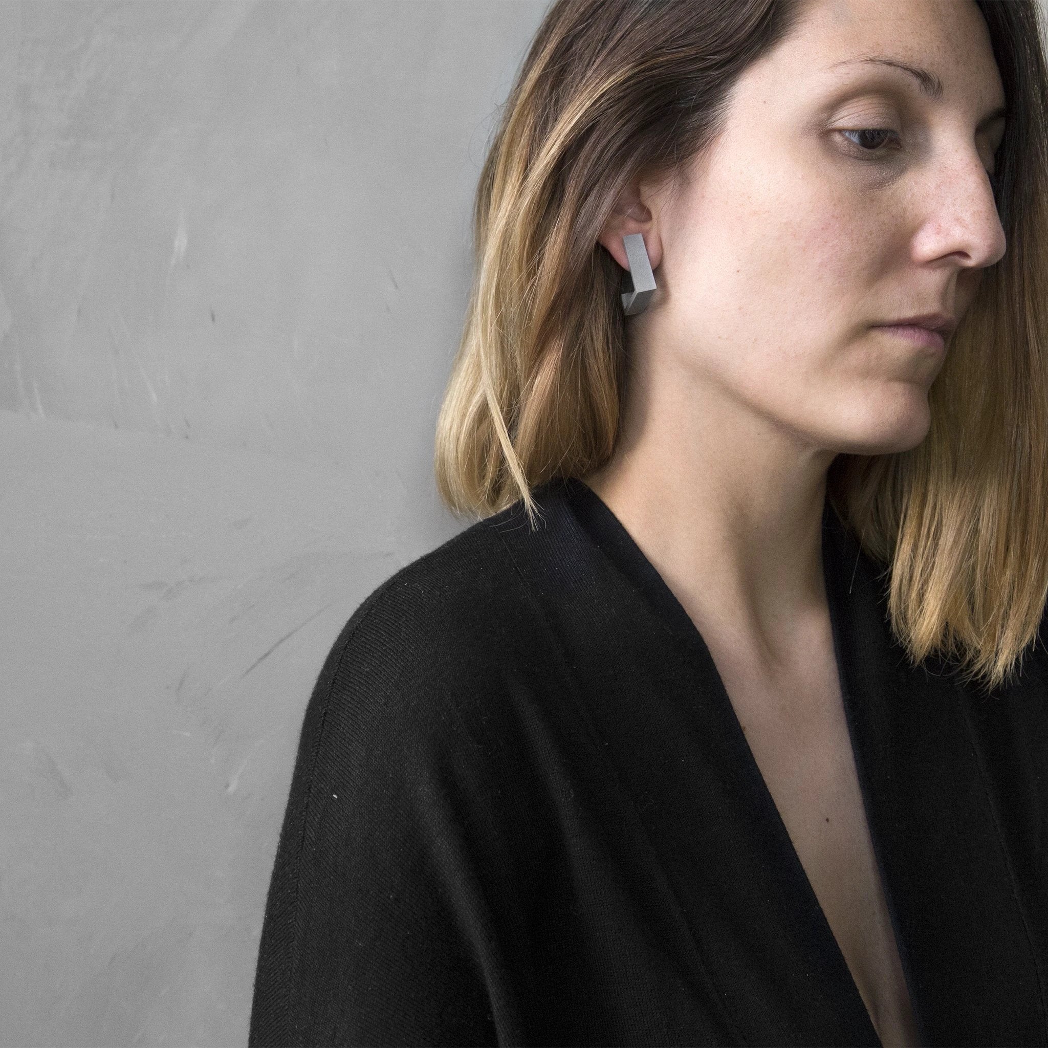 COLUMN NECKLACE & SQUARE EARRINGS is a sculptural minimalist set that turns architectural rigor into everyday elegance. Inspired by Le Corbusier-inspired geometry, this handmade duo from Berlin pairs bold verticality with precise, quiet geometry, creating a look that shifts from disciplined daytime attire to striking evening silhouettes.