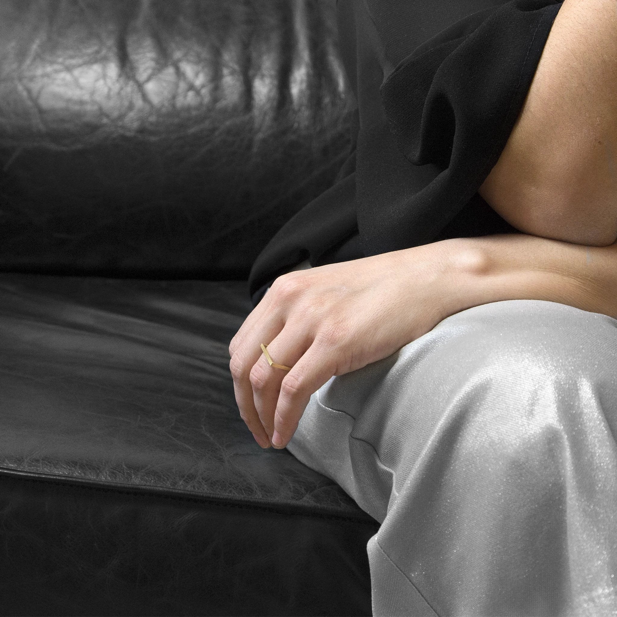 To easily put on or take off your squared ring, rotate it slightly to take advantage of the diagonal diameter, which is longer than the sides. Once the ring is over your knuckle, adjust it for a perfect fit. This technique is especially helpful if you’re styling with other geometric pieces from the collection.