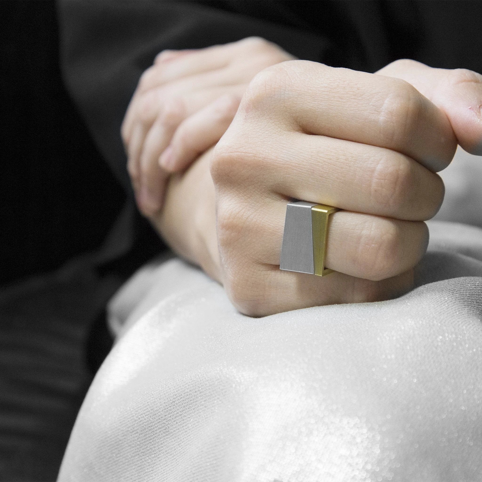 Meet the ALUMINUM AND BRASS SQUARE RINGS — a bold, asymmetric duo designed to redefine everyday jewelry. Part of the SQUARING Collection, this handcrafted set blends sleek minimalism with a subtle architectural twist, delivering a modern statement for any gender. Each ring is handmade in Berlin, so no two pieces are exactly alike, celebrating the beauty of small variations that come from true craftsmanship.